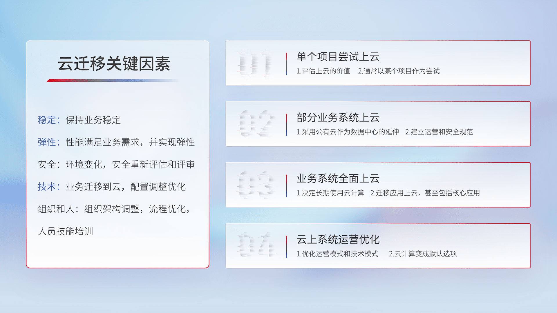 结合实际业务,,,,从规划设计、、云平台选型、、云原生改造、、数据迁移、、集成交付,,,,迁移全过程为客户识别最佳上云路径,,,,做好风险识别管理,,,,设计网络架构、、、身份权限、、、、安全审计合规、、、操作审计、、、、日志审计、、、监控告警策略、、多站点容灾设计等,,对云上基础设施进行整体规划,,,,提升IT治理水平,,以满足弹性、、、、高可用、、高性能的需求。。