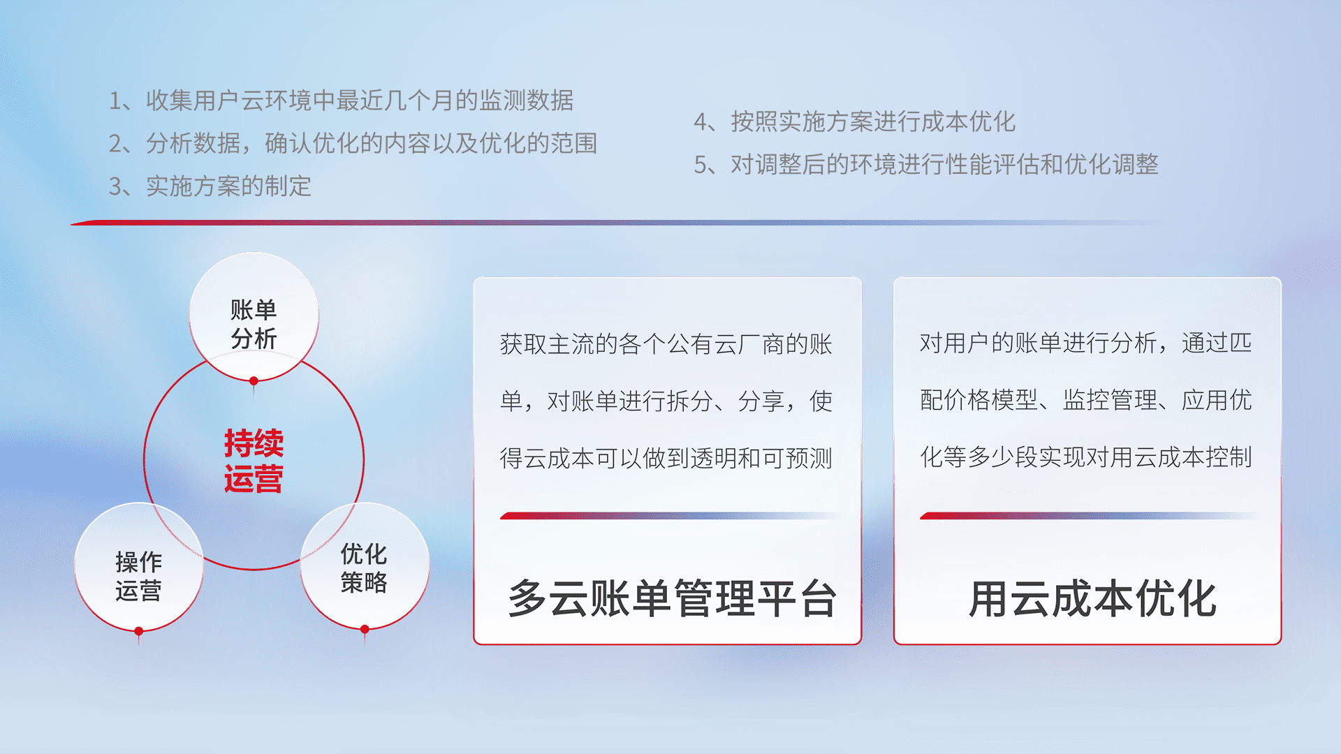 通过多云纳管,,以统一的资源数据模型把客户的云资源进行抽象和封装,,,,进而实现对多云资源的统一操作,,保障云资源管理的可靠性、、、、稳定性与可用性。。量身定制化运维内容,,配置、、、开发运维、、补丁管理、、、、备份、、监控、、、认证和访问管理、、、审计和日常巡检等,,,保障在用云过程中的可靠度,,稳定度以及高可用率。。。。